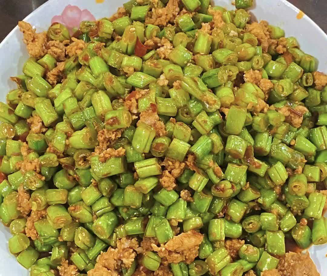 4. 等到猪肉末完全熟透后,再加入豆角段,翻煎均匀,让豆角充分吸收猪肉末的香味。